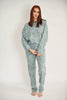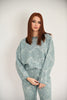 A knitted set featuring a flower-embossed pattern, consisting of high-waisted trousers with an elastic waistband and a sweater with wide-to-slim fit sleeves.Available in light blue with ecru tones, sage green with ecru tones and black colour.